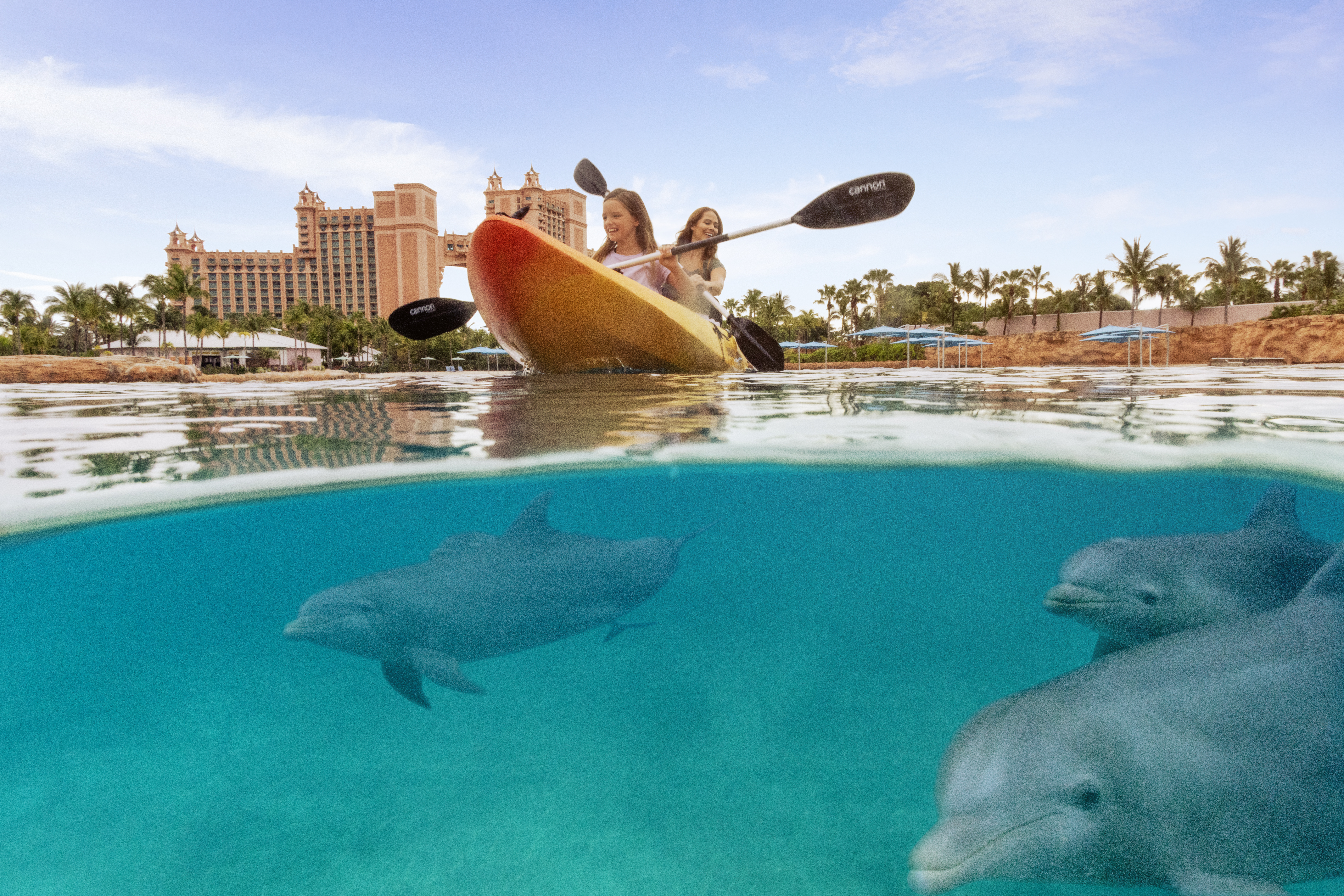 For an experience your kids will never forget, head to Dolphin Cay, Atlantis' premier marine habitat. Here, you can interact with dolphins in their natural environment, swimming alongside these majestic creatures and learning about their behavior from expert trainers.