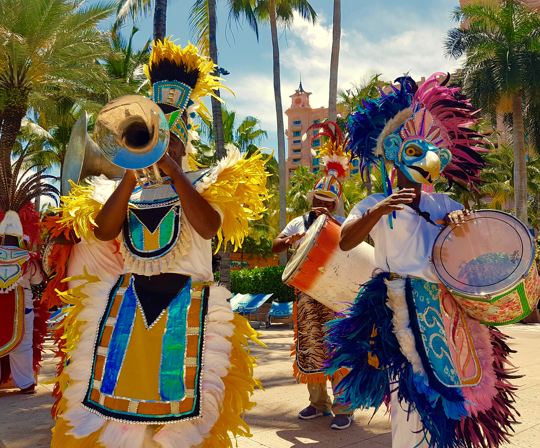 Feel the beat of the goat skin drums, cowbells, horns, and whistles that reveal the joyous spirit of Junkanoo.